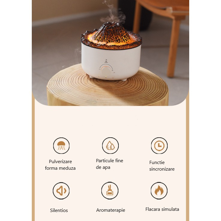 Umidificatorul este un difuzor de aroma elegant si modern. Ofera o iluminare intima cu LED-uri cu consum redus de energie, care confera vaporilor emisi un efect de vulcan.